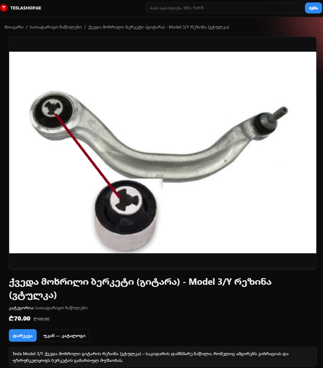 Tesla Model 3/Y ქვედა მოხრილი გიტარის რეზინა (ვტულკა) – საკიდარის დამხმარე ნაწილი, რომელიც ამცირებს ვიბრაციას და უზრუნველყოფს ბერკეტის გამართულ მუშაობას.